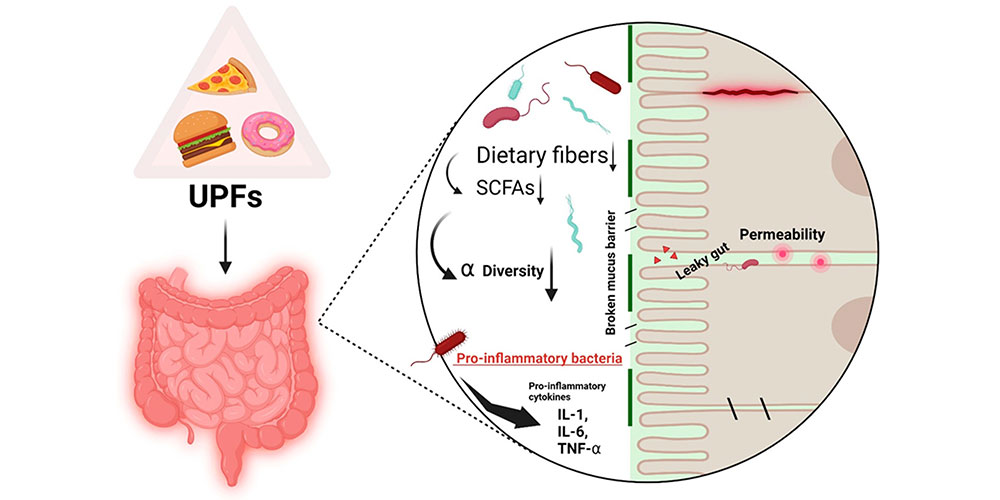 UPFs negatively impact gut health in several ways , including reducing the diversity of the gut microbiota, inducing changes in specific bacterial populations, and contributing to the breakdown of the intestinal barrier, which increases intestinal permeability, leading to the condition known as “leaky gut” as shown in Figure 1. A disrupted gut microbiome balance has been linked to various health issues, including obesity, type 2 diabetes (T2DM), cardiovascular disease (CVD), chronic health conditions, and even some mental health disorders . Here, we will extensively review the available scientific evidence regarding the impact of UPFs on the human gut microbiome and the intestinal ecosystem. We will first describe ultra-processed foods and the gut microbiome, and then we will explore the underlying mechanisms by which UPFs influence microbial composition and functionality, the documented alterations in gut microbial diversity, and the associated health implications. Additionally, we will also discuss the implications for public health policy and potential strategies for mitigating the detrimental effects of UPFs on gut health.